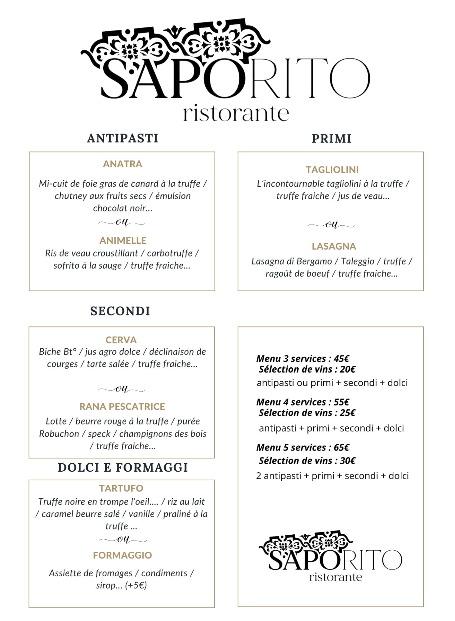 Notre interprétation de la gastronomie italienne Heures d'ouverture Du Mercredi au Samedi 12h à 14h et 19h à 20h30 fête des mères Menu 10-11-12 Mai Ce menu sera disponible le week-end du 10-11-12 mai MIDI ET SOIR Nous serons donc EXCEPTIONNELLEMENT ouvert le dimanche Cliquez sur l’image pour voir le menu en grand. Nouveau Menu du 12 novembre au 20 Décembre ⚠️ NOUS NOUS ADAPTONS À TOUS CHANGEMENT DANS LE MENU TANT QUE NOUS SOMMES PRÉVENUS À L’AVANCE ⚠️ Intolérance, allergie, végétarien… Cliquez sur le menu pour le voir en plein écran.Vous trouverez également le lunch de la semaine sur notre page Facebook.